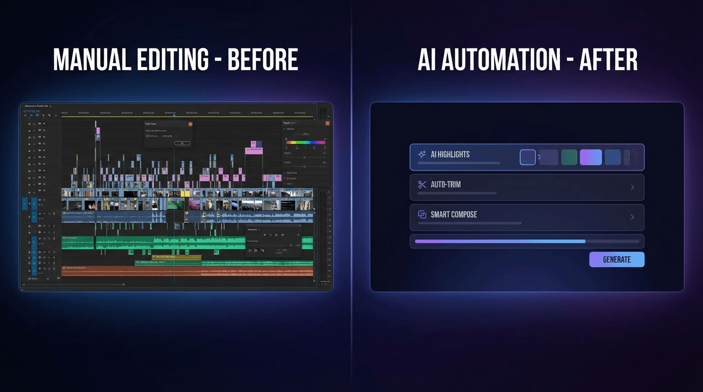 Comparison between manual video editing and AI-automated video repurposing workflow