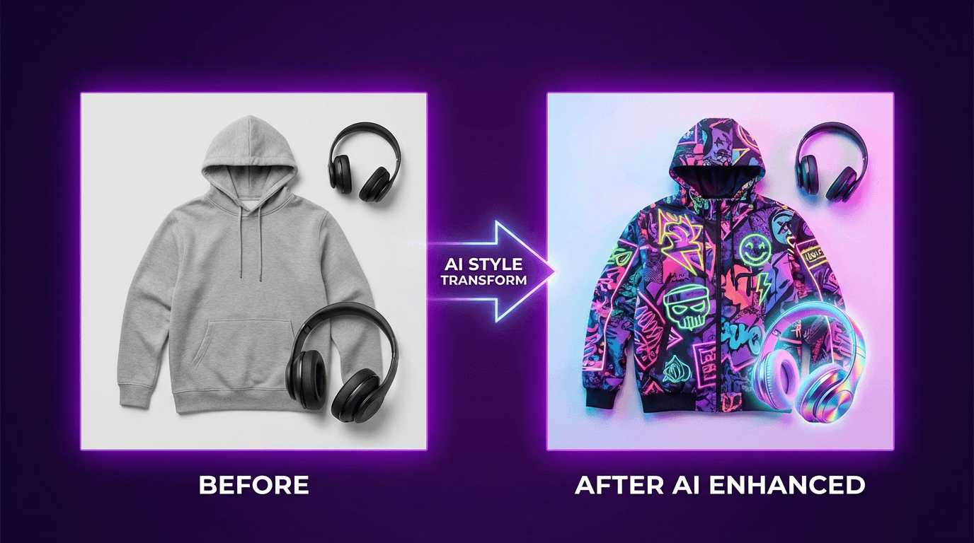 E-commerce product showcase displaying before and after AI style transformations for fashion and tech items with vibrant lighting