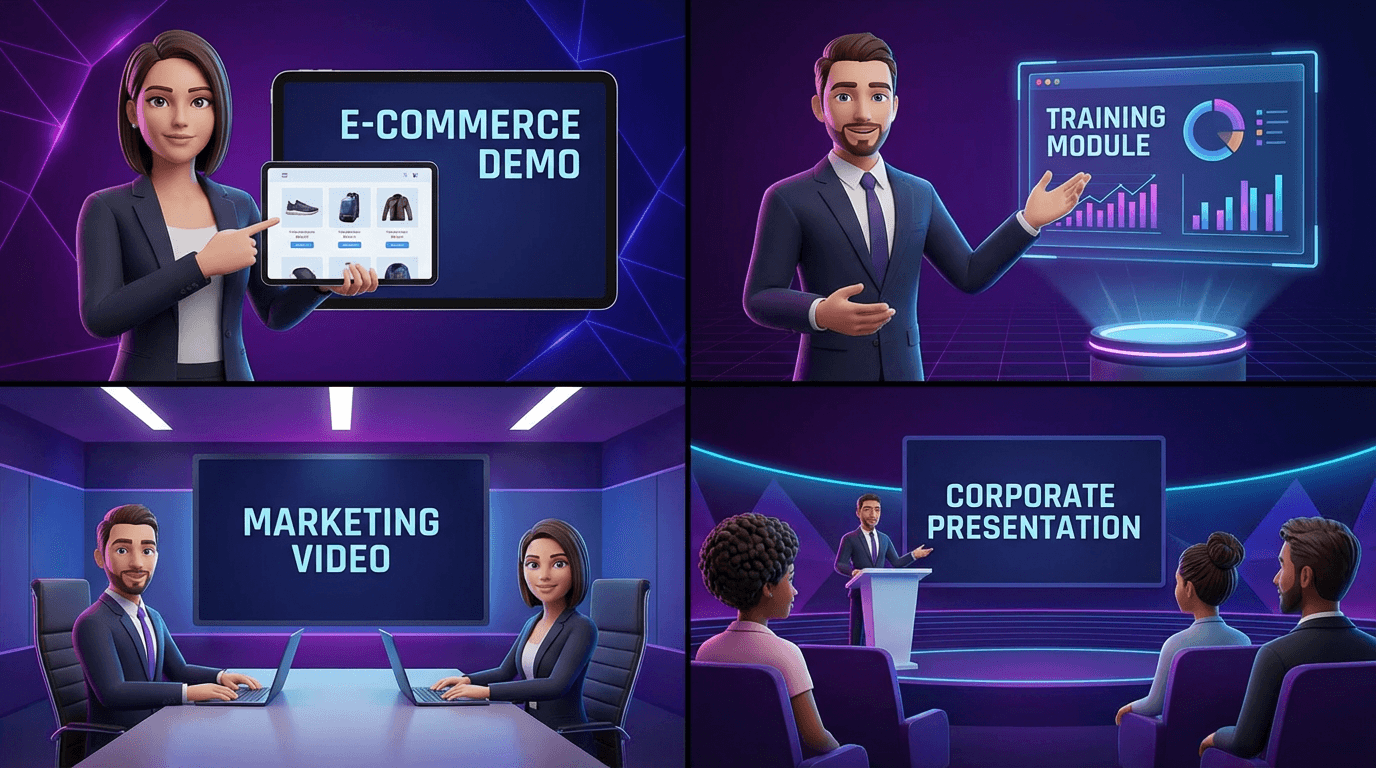 Digital avatars presenting content across multiple business scenarios including e-commerce and training