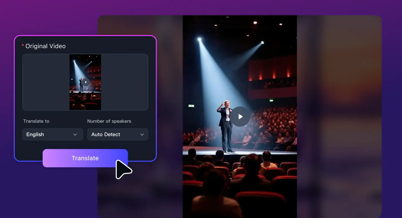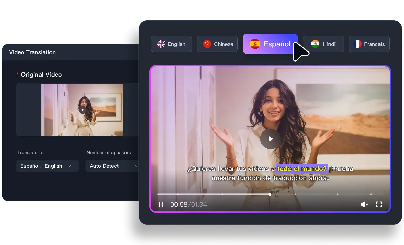 Sube un video y reemplaza el audio por el idioma objetivo, compatible con 170+ idiomas, logrando sincronización de labios, doblaje localizado y subtítulos precisos para presentar tu mensaje globalmente.