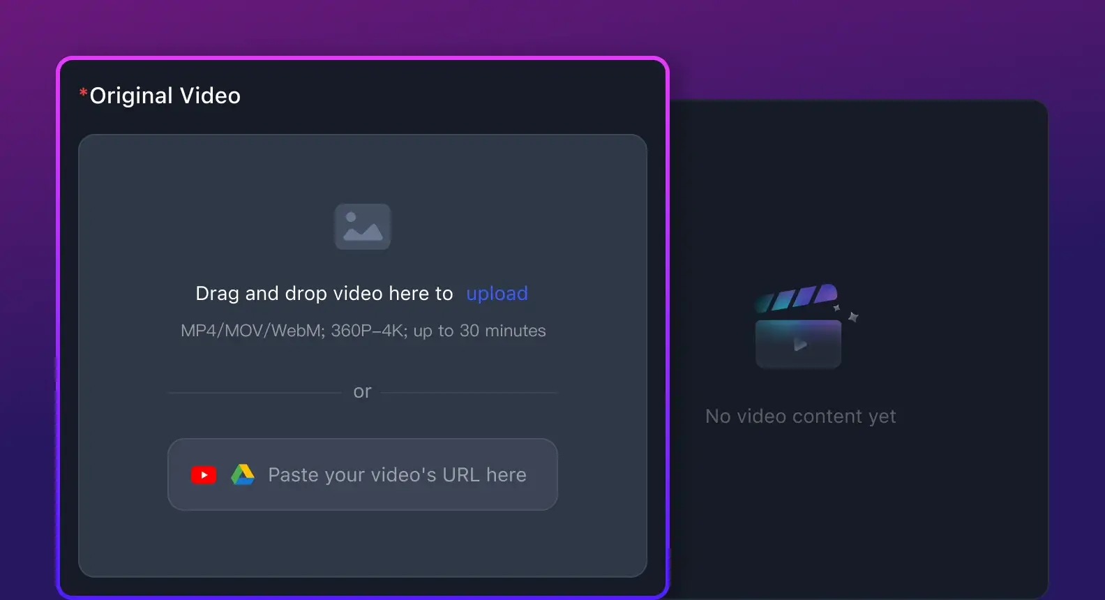 Puedes subir videos desde tu dispositivo local, YouTube o Google Drive.