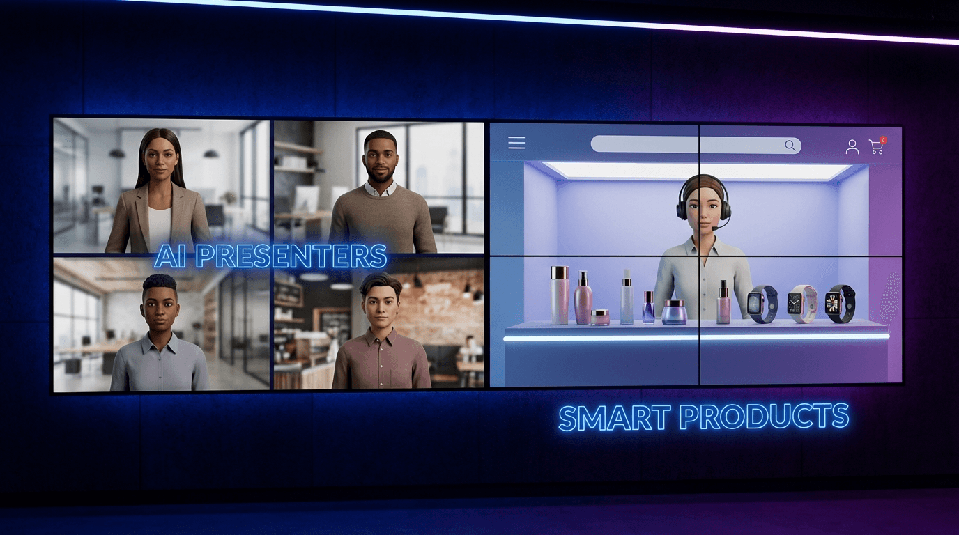 Diverse AI avatars presenting e-commerce products in professional video production settings