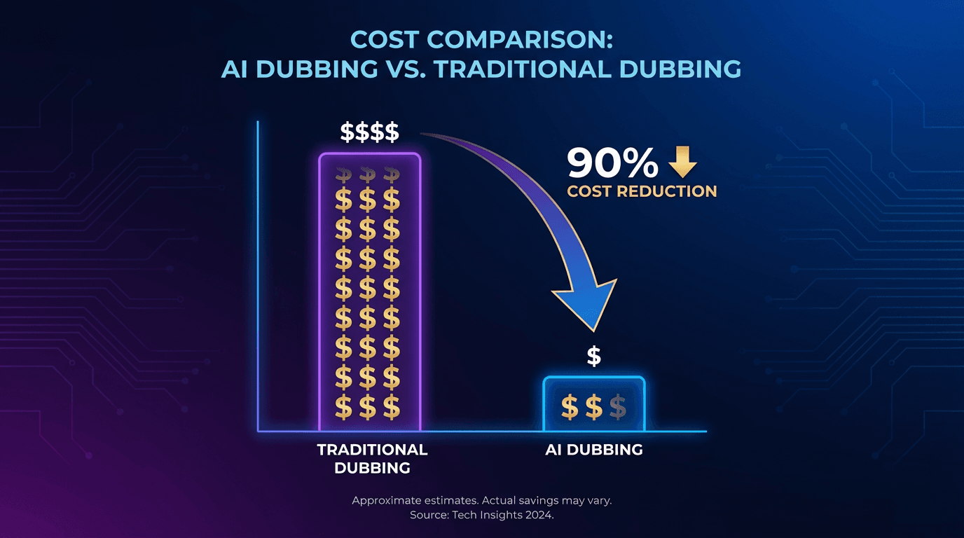 Cost comparison infographic showing AI dubbing saves up to 90% compared to traditional dubbing