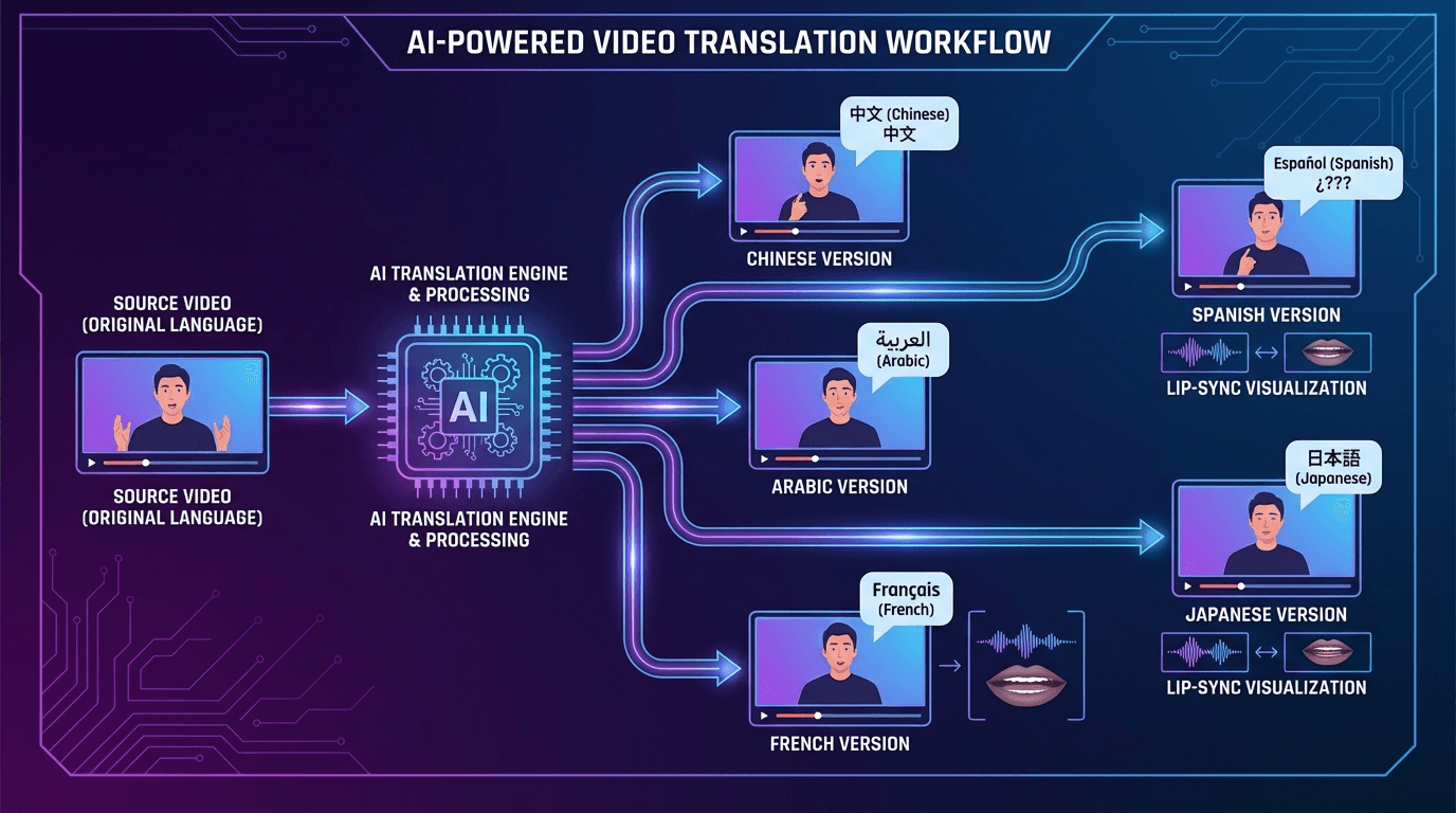 AI video translation workflow showing single video transforming into multiple languages with lip-sync