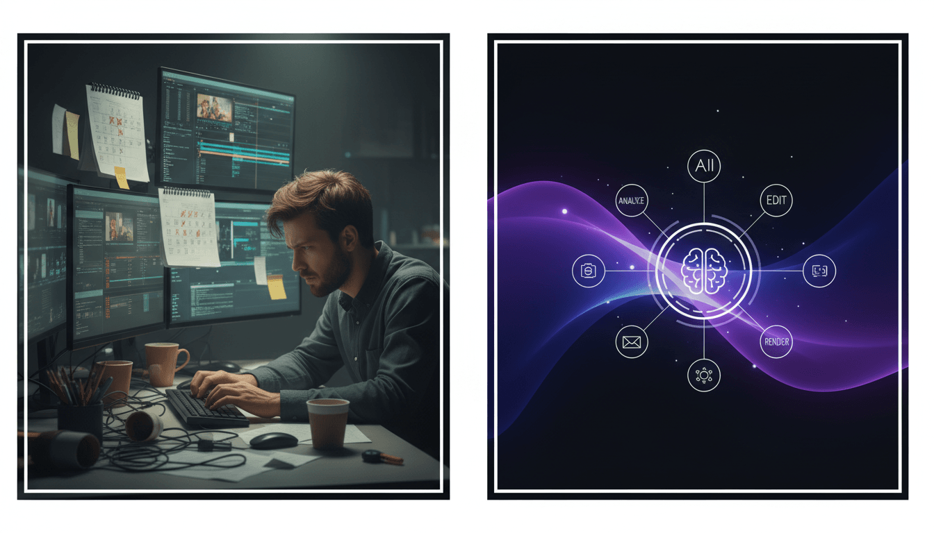 Comparison of traditional video editing versus AI-powered automated commercial creation workflow