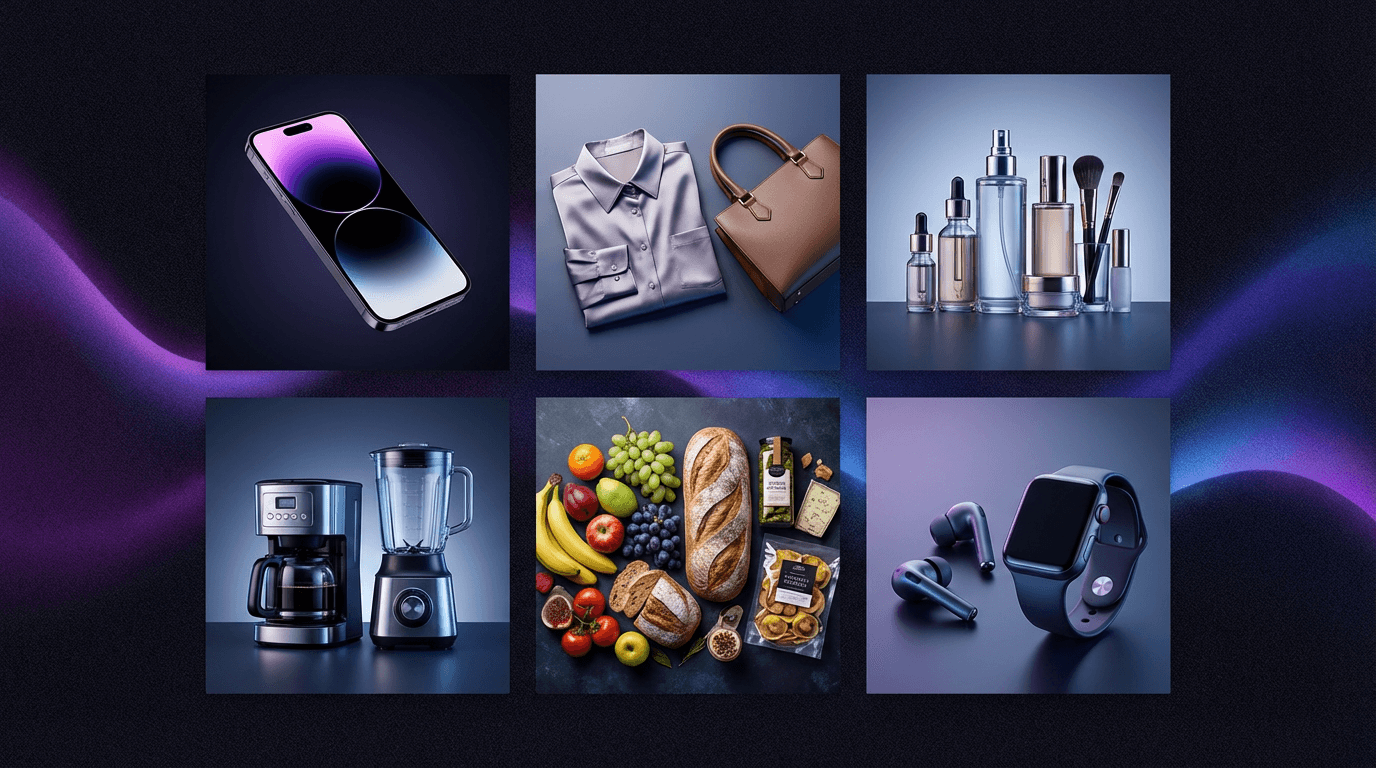 Various product categories suitable for AI commercial maker including tech, fashion, cosmetics, and home goods