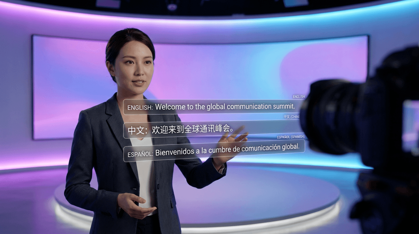 Digital avatar with multilingual subtitle support demonstrating AI commercial maker language capabilities