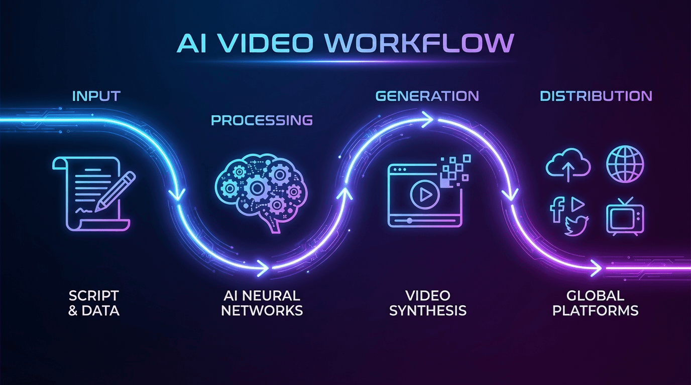 An AI video generator workflow integrates artificial intelligence tools across the entire video production process. Instead of coordinating cameras, actors, editors, and studios, you orchestrate AI-powered systems that handle each stage automatically.