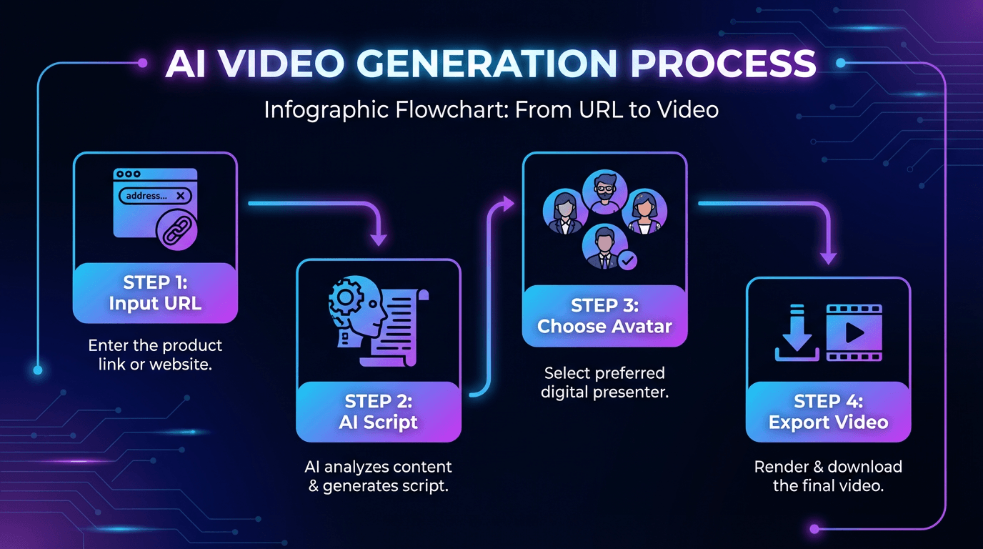 Step-by-step workflow showing AI video ad creation process from URL to final export