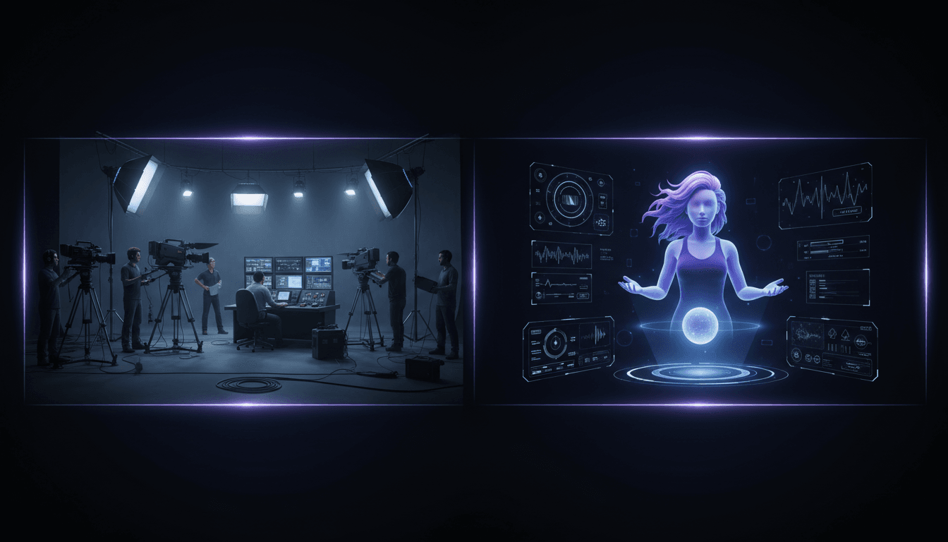 Split screen comparison showing traditional video production studio versus AI interface with digital avatar