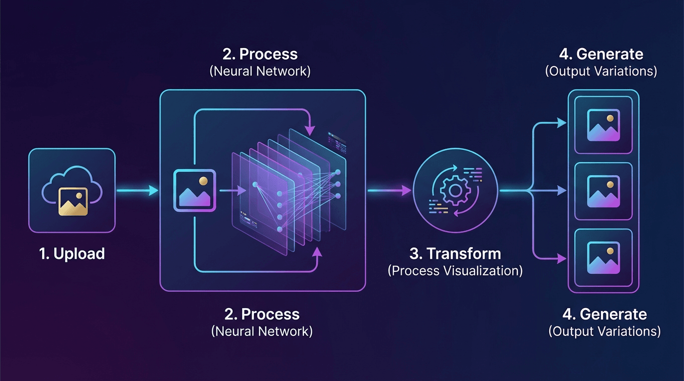 The key difference from text-to-image generation is preservation. While text-to-image creates entirely new visuals from descriptions, image to image AI uses your existing photo as a foundation. Machine learning models trained on massive image datasets analyze composition, lighting, and forms in your original picture, then blend them with concepts from your prompt.
