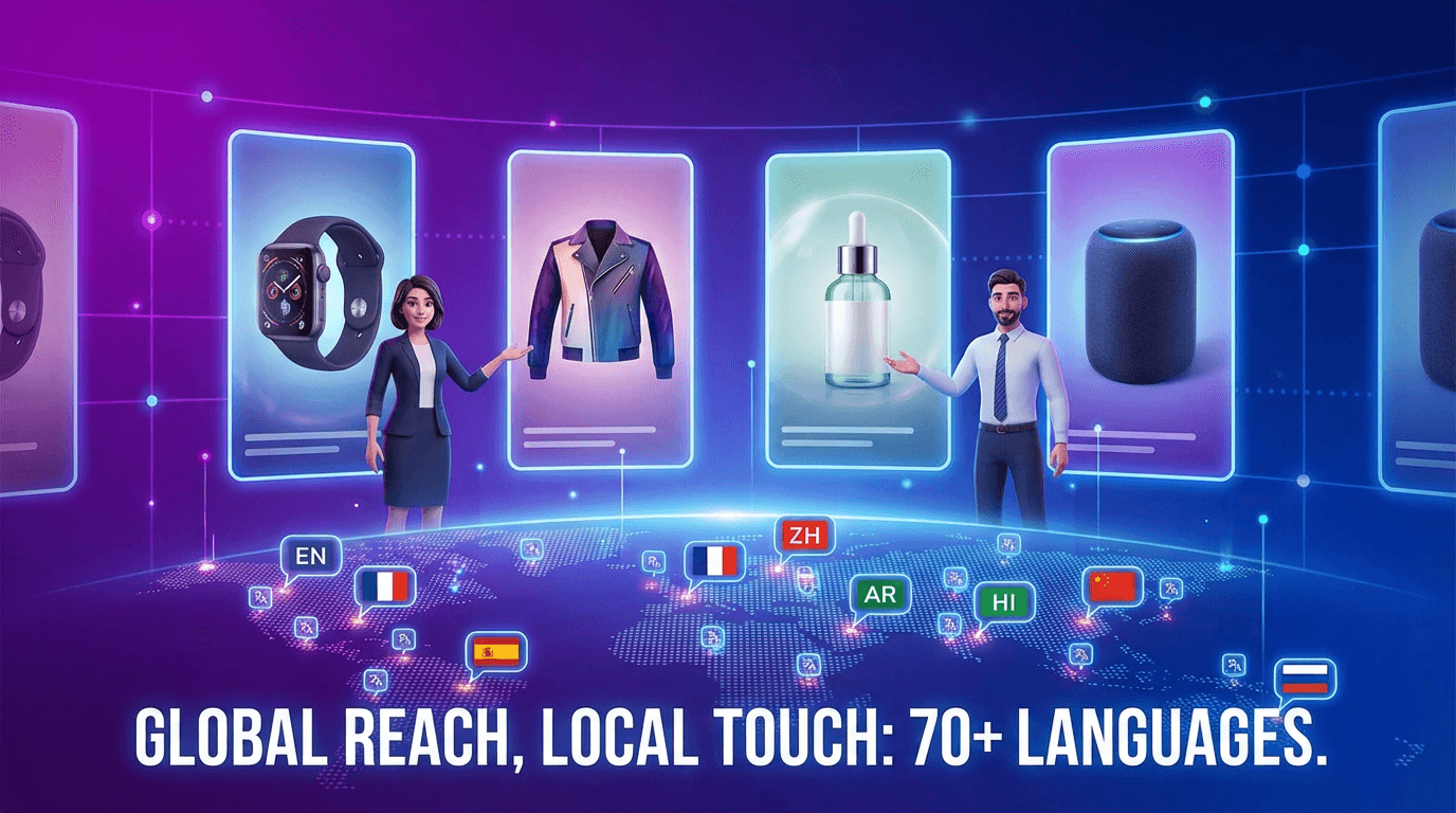 E-commerce product showcase with diverse items (tech gadgets, fashion items, cosmetics, home goods) being transformed into vertical video format thumbnails, global map with language icons showing 70+ languages, digital avatars presenting products, dynamic composition with purple and blue gradient background, professional marketing aesthetic