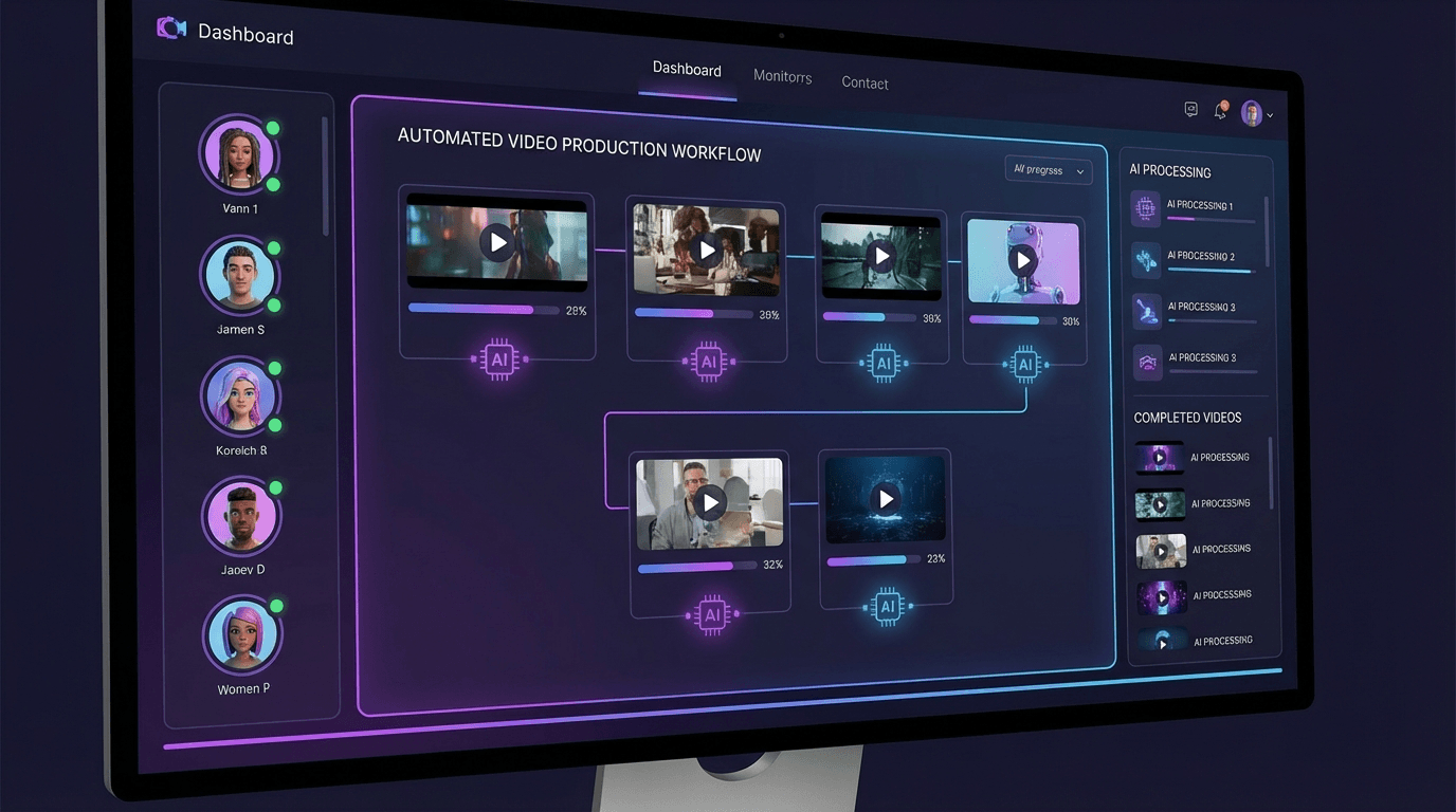 Dashboard interface showing automated video production workflow, multiple video thumbnails being generated simultaneously, progress bars and AI processing indicators, diverse digital avatars in circular frames, dark background with purple and blue gradient accents, modern tech aesthetic, clean UI design