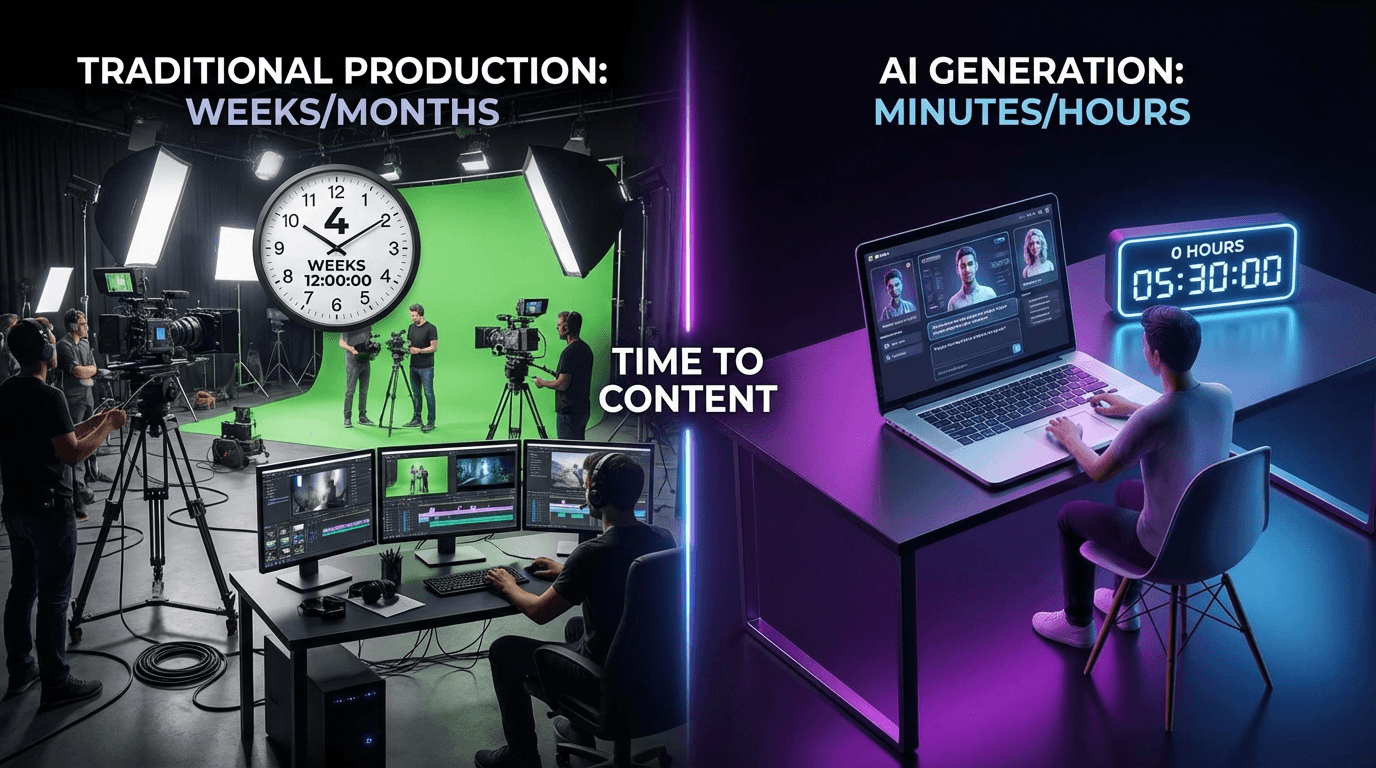 Split screen comparison showing traditional video production (cameras, lights, editing software) versus AI video generation (simple laptop interface with digital avatars), clock showing time difference, modern minimalist design, dark background with vibrant purple and blue accents