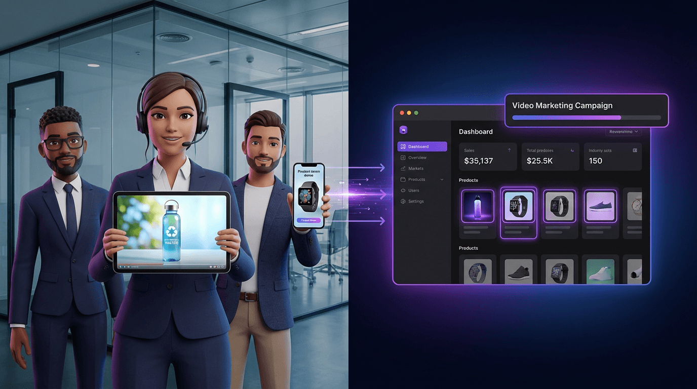 Diverse digital avatars in professional business settings presenting products on mobile phones and tablets, split screen showing e-commerce platforms, bright product imagery with purple gradient accents, dark background, modern corporate aesthetic, dynamic composition showcasing video marketing workflow