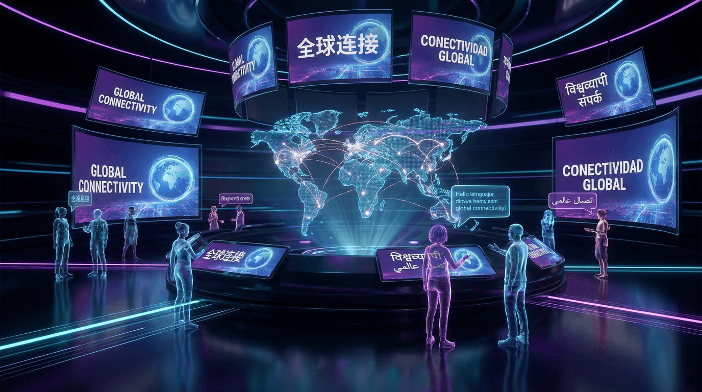 3D rendered scene of multiple video screens displaying product ads in different languages, global connectivity theme with world map hologram, diverse digital avatars speaking different languages, vibrant colors with purple-blue accents, dark futuristic background, cinematic lighting emphasizing multilingual capabilities