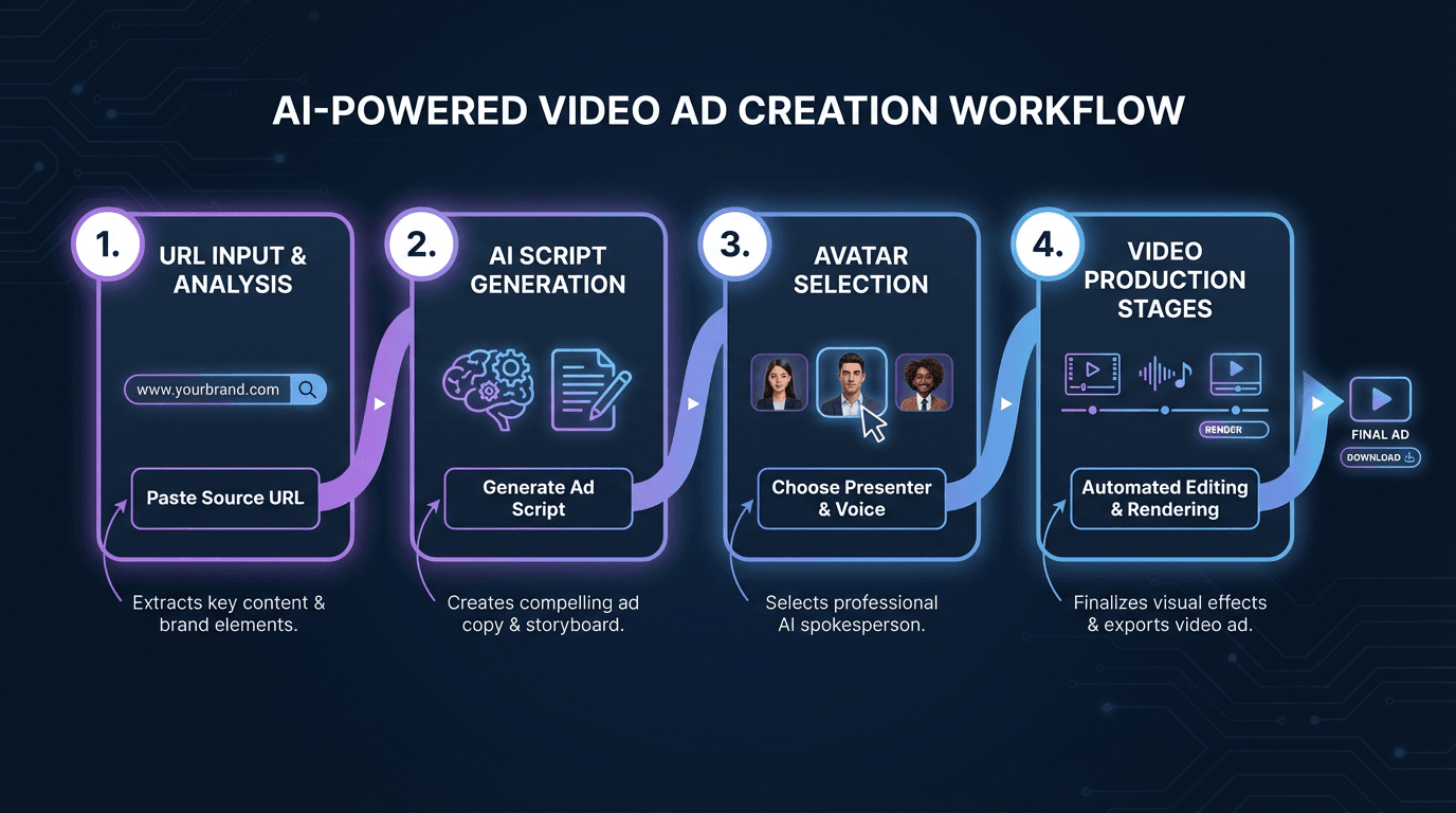 Infographic-style visual showing video ad creation workflow: URL input, AI script generation, avatar selection, video production stages, with numbered steps 1-2-3-4, clean labels and annotations, purple and blue gradient connections between stages, dark background, professional diagram style