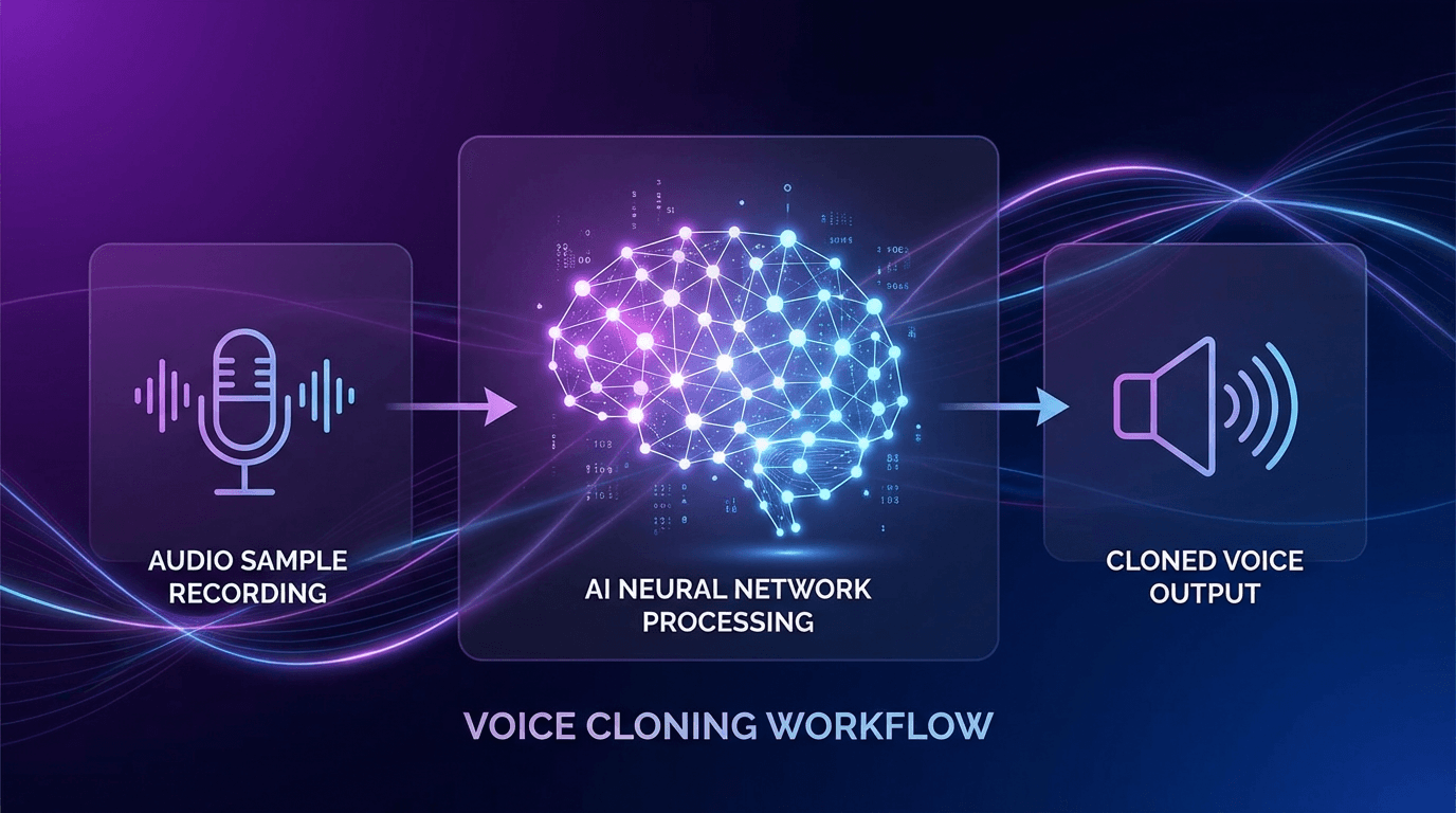 Voice cloning workflow diagram showing audio input, AI processing, and voice output