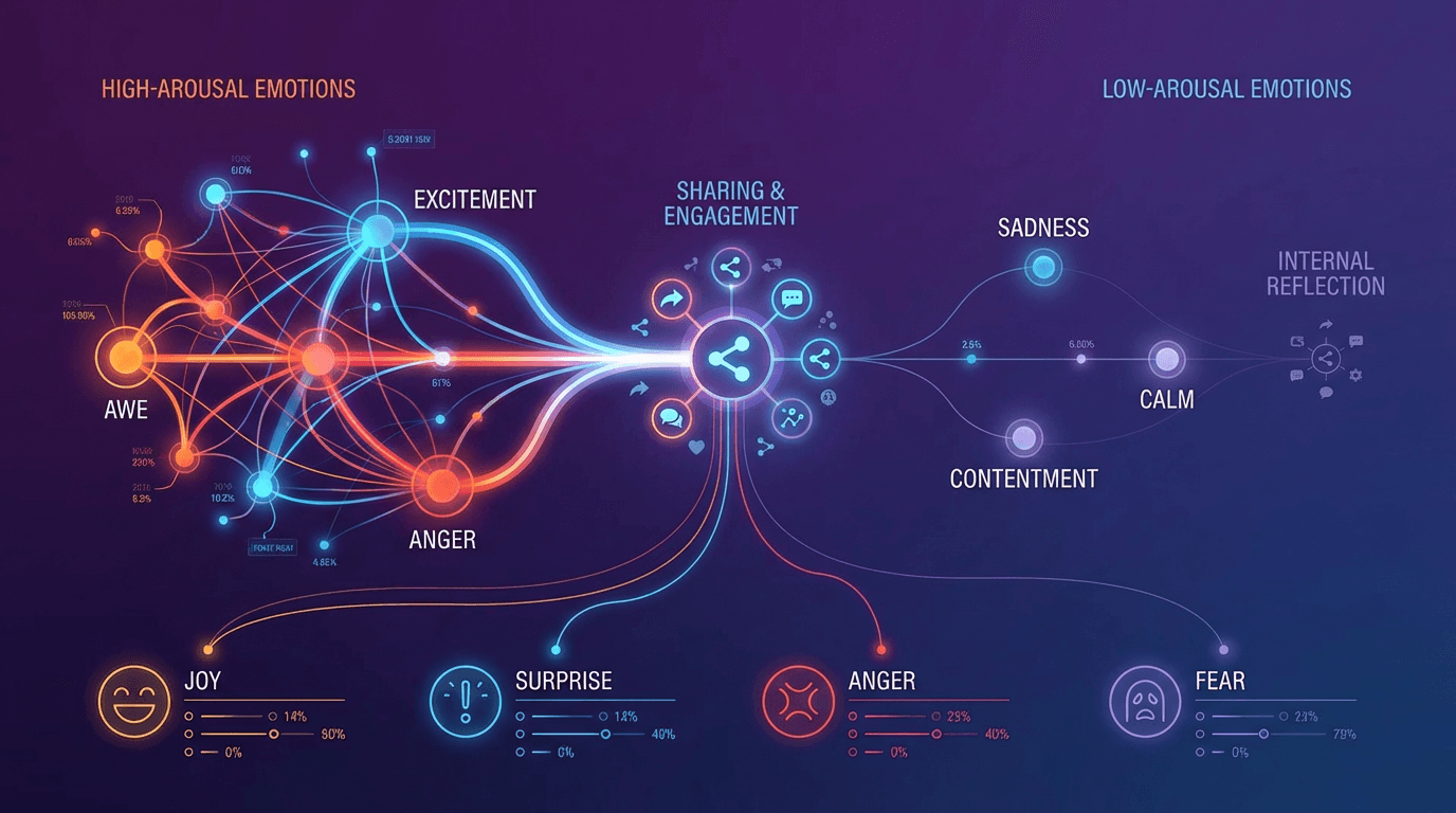 High-arousal emotions include awe, excitement, anger, anxiety, and surprise. These emotions activate your sympathetic nervous system—increasing heart rate and stress hormones—creating a physiological readiness to act. That includes the act of sharing.