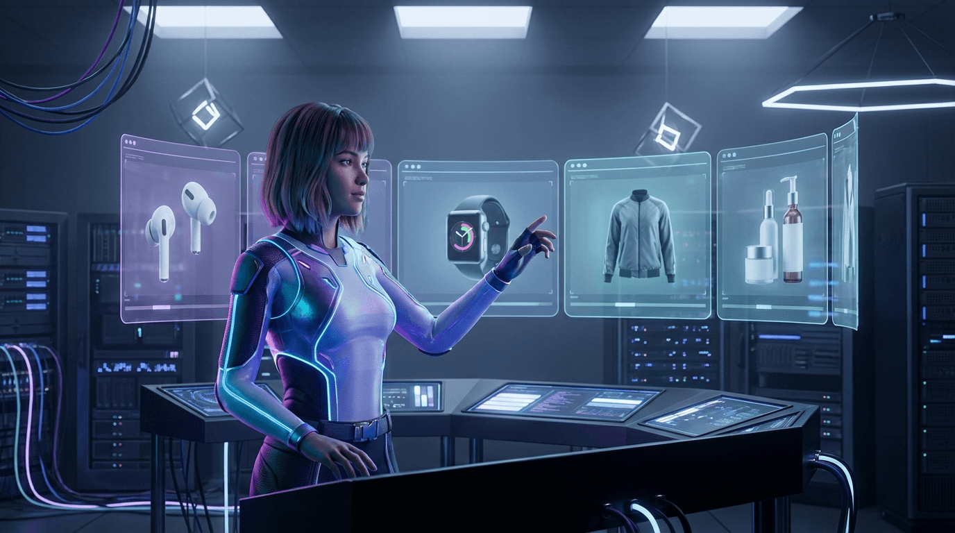 AI digital human avatar presenting e-commerce products on holographic screens